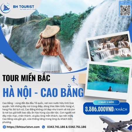 Buổi sáng : Hướng dẫn viên & xe của Công ty du lịch BH Tourist đón Quý Khách tại SÂN BAY QUỐC TẾ NỘI BÀI (HÀ NỘI). Quý Khách di chuyển thẳng về Thành Phố Cao Bằng.